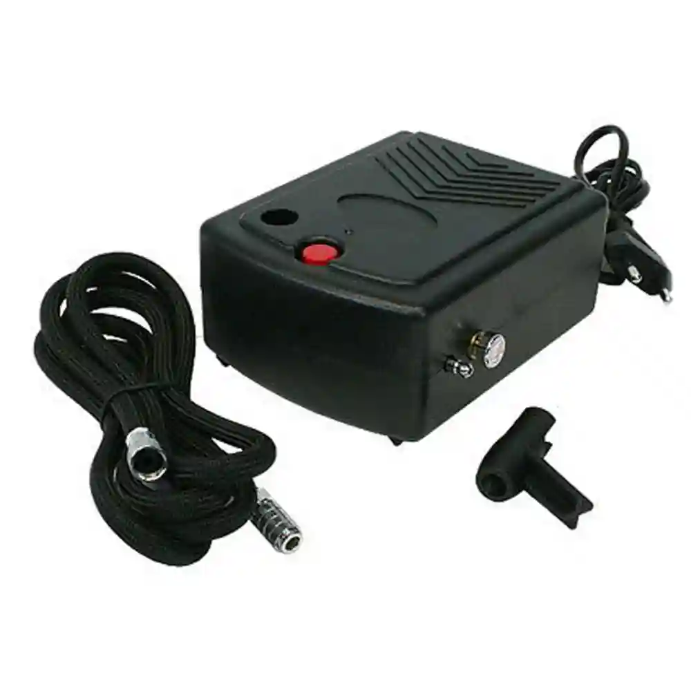 Компрессор поршневой, безмасляный, одноцилиндровый, с автостопом и регулятором давления, предназначен для работы с аэрографом. Работает в одном режиме, при котором воздух подается постоянно, но автоматически отключается, когда его не используют.