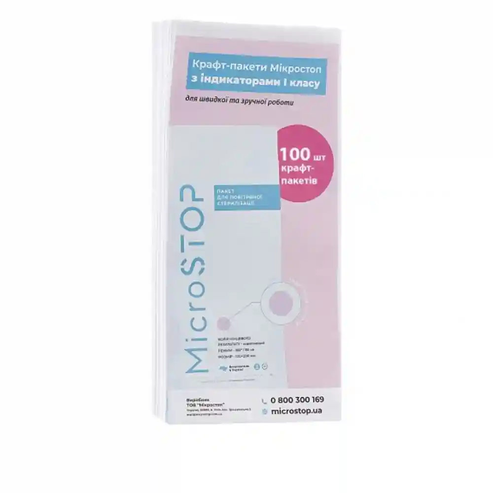 Крафт-пакеты Микростоп предназначены для паровой и воздушной стерилизации маникюрно-педикюрного, косметического инструмента. Разработаны для профессионального применения. Материал - плотная качественная бумага. Обладают термостойкостью. Лицевая поверхность крафт-пакета снабжена фирменной маркировкой и местом для приклеивания индикатора.