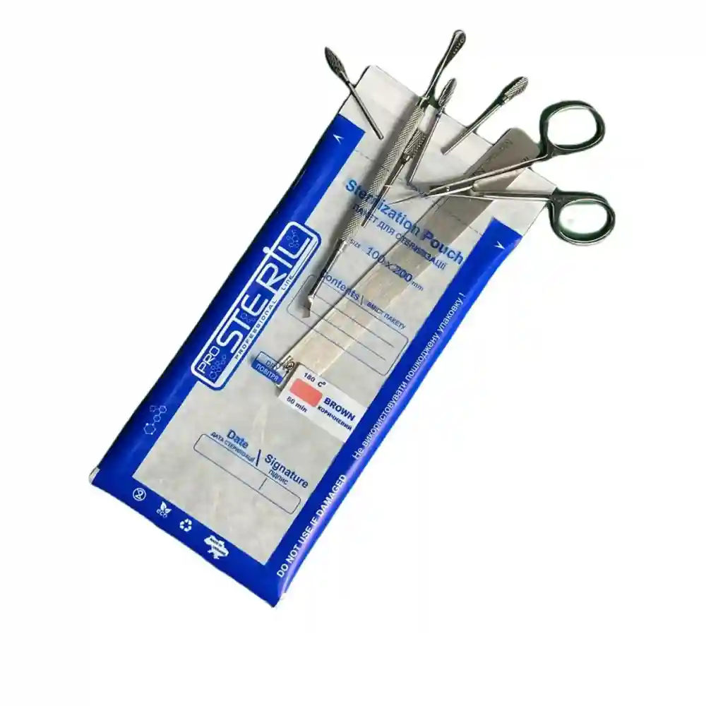 Процедура стерилизации состоит из трех этапов: ручная или автоматическая чистка инструментов, дезинфекция инструментов в специальных растворах и затем стерилизация сухого инструмента в сухожаровом шкафе. Бумажные пакеты используются на третьем этапе.